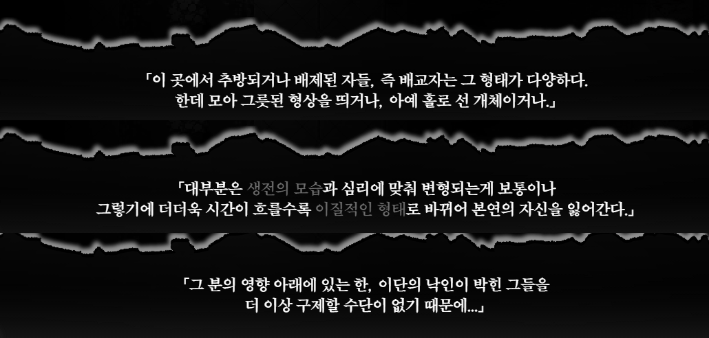사실 방 안에 배치된 일지를 읽고 나면 어느 정도 유추가 가능한 부분이지만, 도망자를 포함한 이곳에 널브러진 인형들 대부분은 단순 천 쪼가리가 아닌 배교자의 영혼이 실체화된 크리쳐다. (허나 자유의지가 없기 때문에 그렇게 평생을 존재한다.) 정중앙에 유독 커다란 개체가 있는 만큼 개중에서는 우두머리도 있었다.